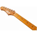 Гриф и накладка на гриф выполнены из печеного клена (roasted maple). При такой обработке поры дерева максимально сжимаются и в процессе использования вода уже не будет выходить, ваша накладка не сожмется и лады не повылазят вне зависимости от влажности и смены температуры. Плюс такое дерево выглядит очень красиво.